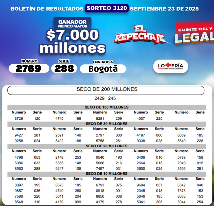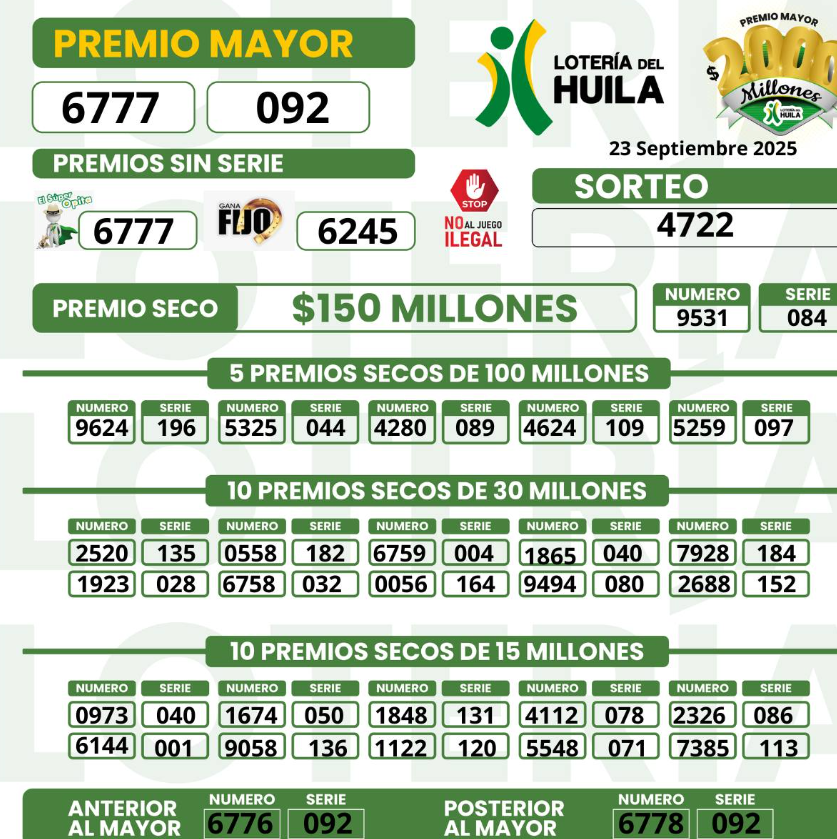 Este martes 23 de SEPTIEMBRE del año 2025 jugaron las Loterías de la Cruz Roja y la del Huila, para un total de 9.000 millones de pesos, solo sumando sus dos premios mayores.