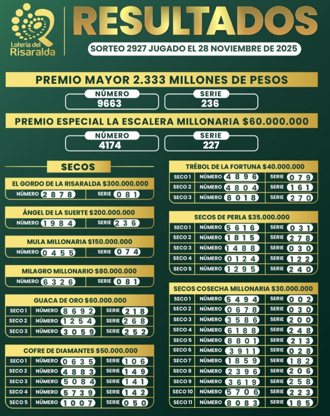 Además, le traemos todos los resultados de la Lotería de Risaralda, con un premio mayor de 2.333 millones de pesos y que es para el número 9663, de la SERIE 236:
