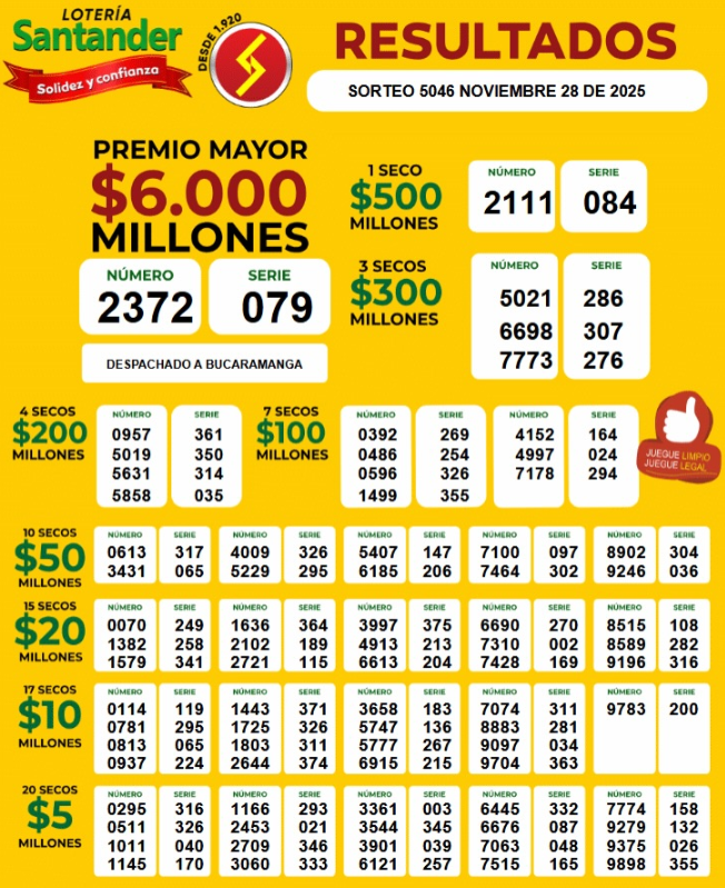 También está la Lotería de Santander, que sortea 6 mil millones de pesos ($ 6.000.000.000) de premio mayor y todos estos premios secos: