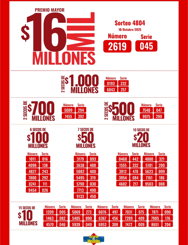 Este viernes 10 de OCTUBRE de 2025, “la de Medellín” sorteó un GRAN premio mayor de diez y seis mil millones de pesos ($ 16.000.000.000) y más de 30 premios secos: