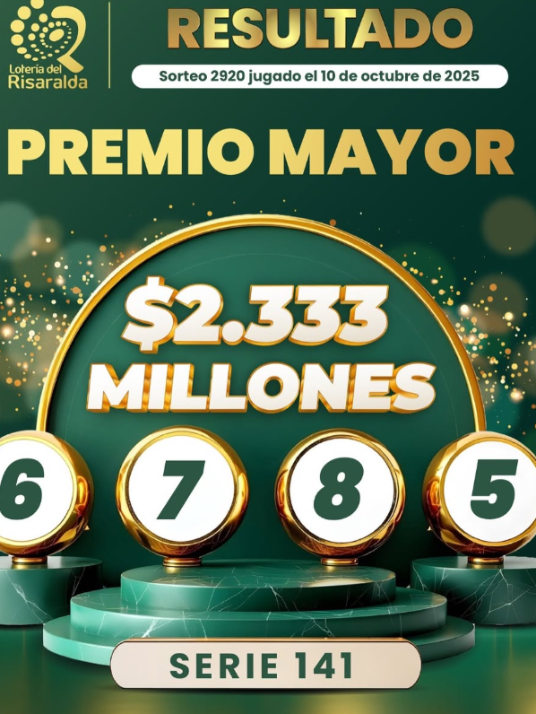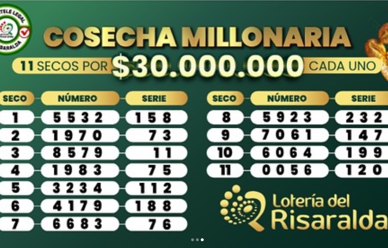 Además, le traemos todos los resultados de la Lotería de Risaralda, con un premio mayor de 2.333 millones de pesos y que es para el número 7714, de la SERIE 224: