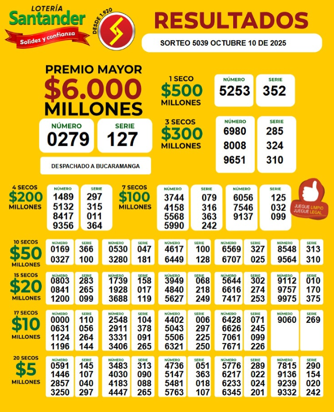 También está la Lotería de Santander, que sortea 6 mil millones de pesos ($ 6.000.000.000) de premio mayor y todos estos premios secos: