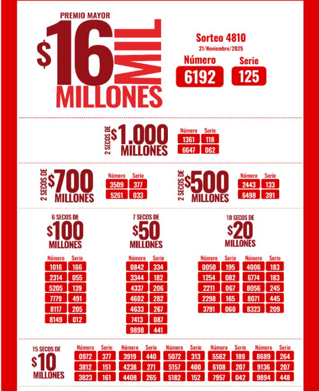 Este viernes 21 de NOVIEMBRE de 2025, “la de Medellín” sorteó un GRAN premio mayor de diez y seis mil millones de pesos ($ 16.000.000.000) y más de 30 premios secos: