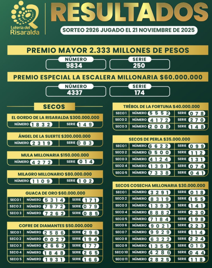 Además, le traemos todos los resultados de la Lotería de Risaralda, con un premio mayor de 2.333 millones de pesos y que es para el número 9834, de la SERIE 250. Y, además, también se sortearon otros premios secos millonarios: