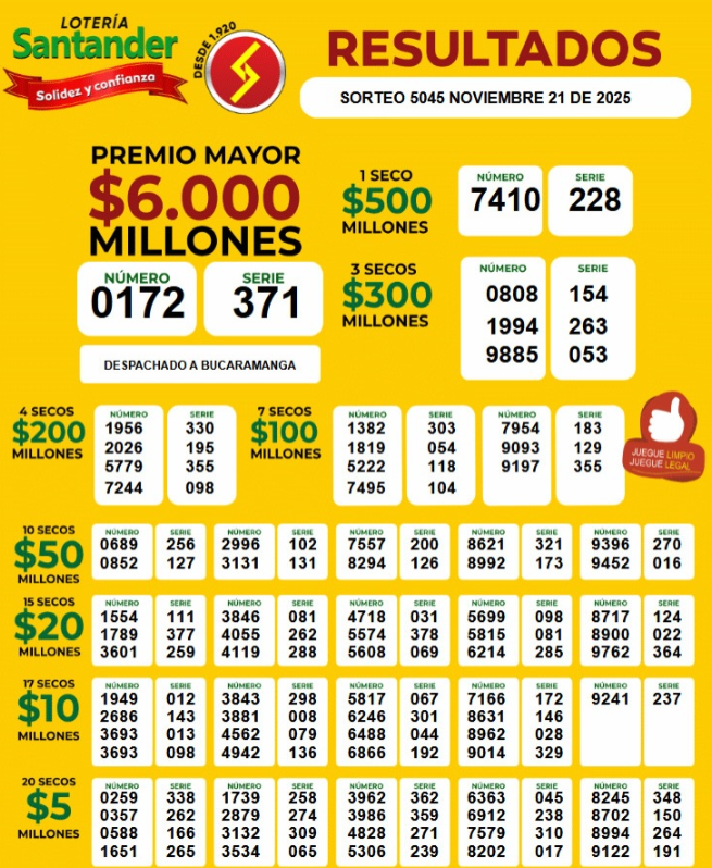 También está la Lotería de Santander, que sortea 6 mil millones de pesos ($ 6.000.000.000) de premio mayor y todos estos premios secos: