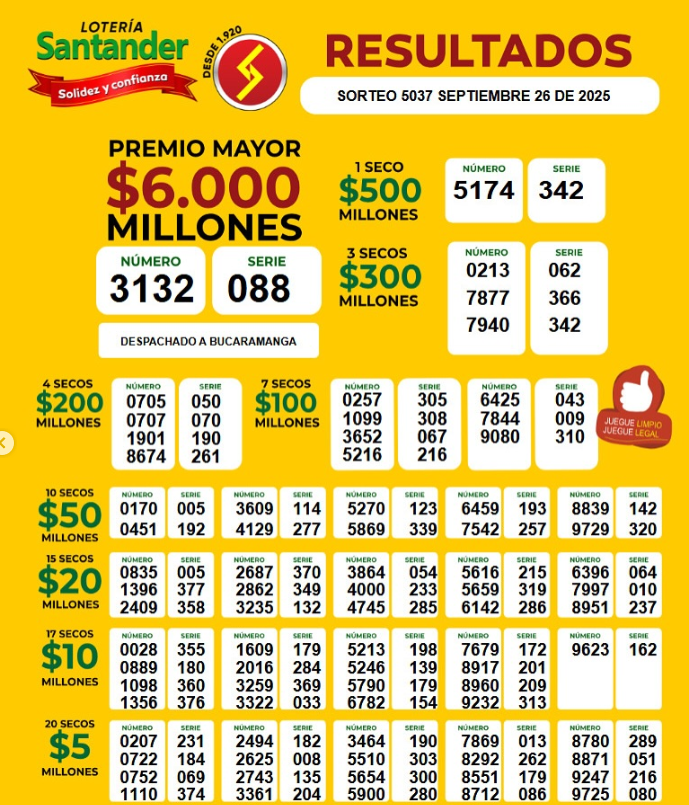 También está la Lotería de Santander, que sortea 6 mil millones de pesos ($ 6.000.000.000) de premio mayor y todos estos premios secos: