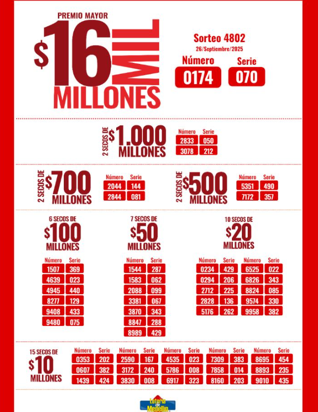 Este viernes 26 de SEPTIEMBRE de 2025, “la de Medellín” sorteó un GRAN premio mayor de diez y seis mil millones de pesos ($ 16.000.000.000) y más de 30 premios secos.