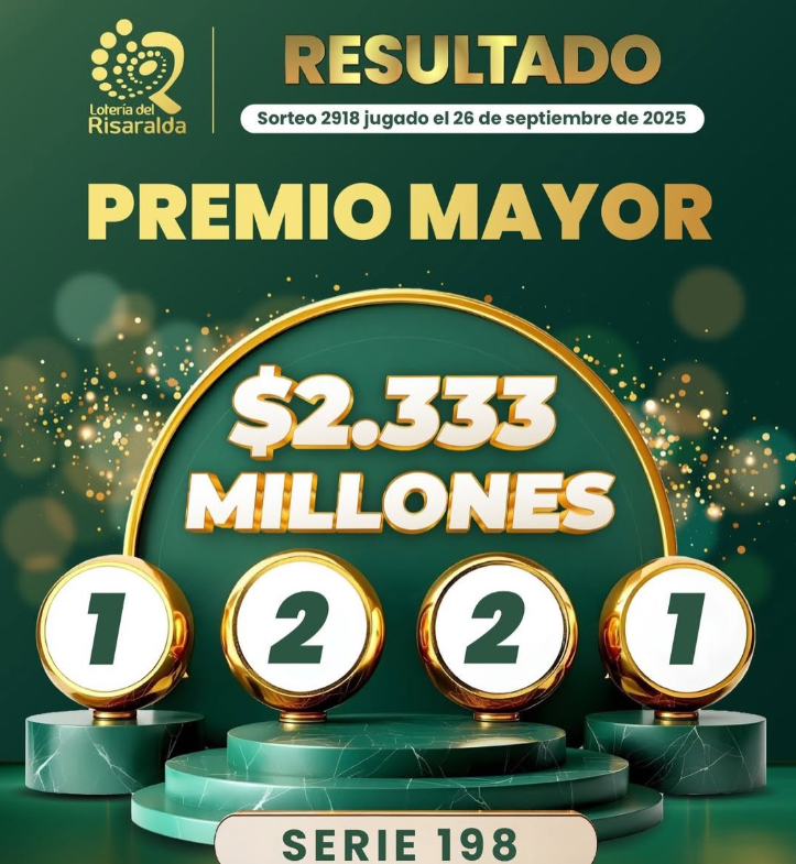Además, le traemos todos los resultados de la Lotería de Risaralda, con un premio mayor de 2.333 millones de pesos y que es para el número 1221, de la SERIE 198: