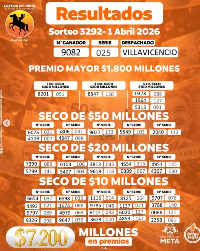 Pero aquí en www.rutanoticias.co le damos mucho gusto con el resultado del Baloto y la Lotería de Manizales, la del Valle y la de Meta. ¿Quiere más? Mire estos resultados de la Lotería del Meta, cuyo PREMIO MAYOR fue vendido en VILLAVICENCIO: