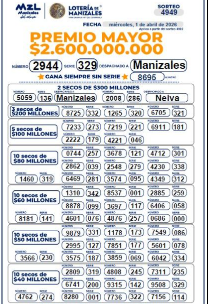 OJO a los resultados de la Lotería de Manizales, con su premio mayor de $ 2.600 millones que es para el NUMERO 2944 de la Serie 329: