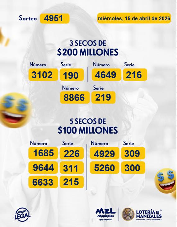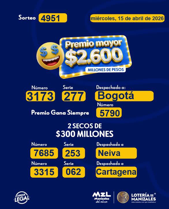 OJO a los resultados de la Lotería de Manizales, con su premio mayor de $ 2.600 millones que es para el NUMERO 3173 de la Serie 277: