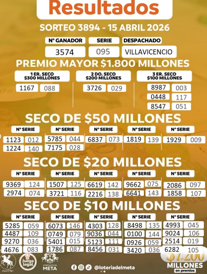 Pero aquí en www.rutanoticias.co le damos mucho gusto con el resultado del Baloto y la Lotería de Manizales, la del Valle y la de Meta. ¿Quiere más? Mire estos resultados de la Lotería del Meta, cuyo PREMIO MAYOR fue vendido en VILLAVICENCIO: