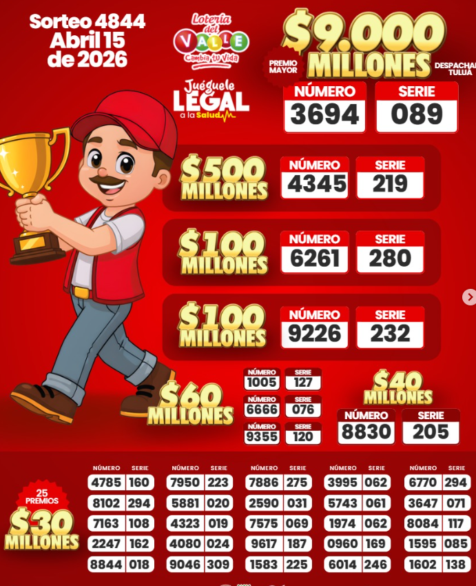 Revise…revise muy bien estos resultados de la Lotería del Valle y ADEMÁS el premio mayor, que fue vendido en TULUA: