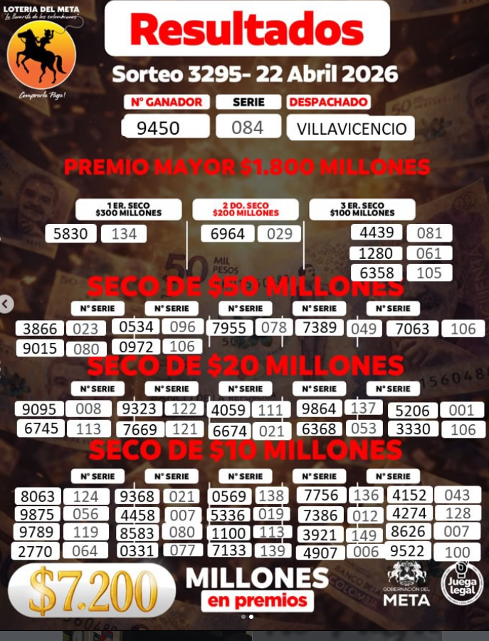 Pero aquí en www.rutanoticias.co le damos mucho gusto con el resultado del Baloto y la Lotería de Manizales, la del Valle y la de Meta. ¿Quiere más? Mire estos resultados de la Lotería del Meta, cuyo PREMIO MAYOR fue vendido en VILLAVICENCIO: