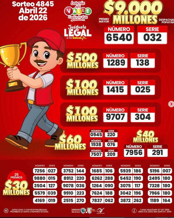 Revise…revise muy bien estos resultados de la Lotería del Valle y ADEMÁS el premio mayor, que fue vendido en POPAYAN:
