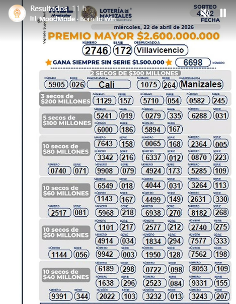 OJO a los resultados de la Lotería de Manizales, con su premio mayor de $ 2.600 millones que es para el NUMERO 2746 de la Serie 172: Y revise también todos sus premio$ millonario$: