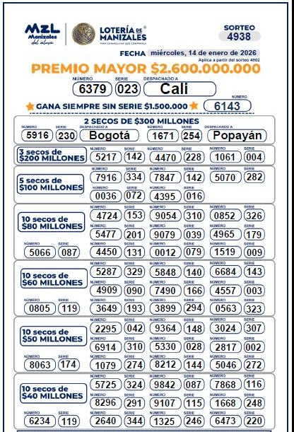 OJO a los resultados de la Lotería de Manizales, con su premio mayor de $ 2.600 millones que es para el NUMERO 6379, de la Serie 023: