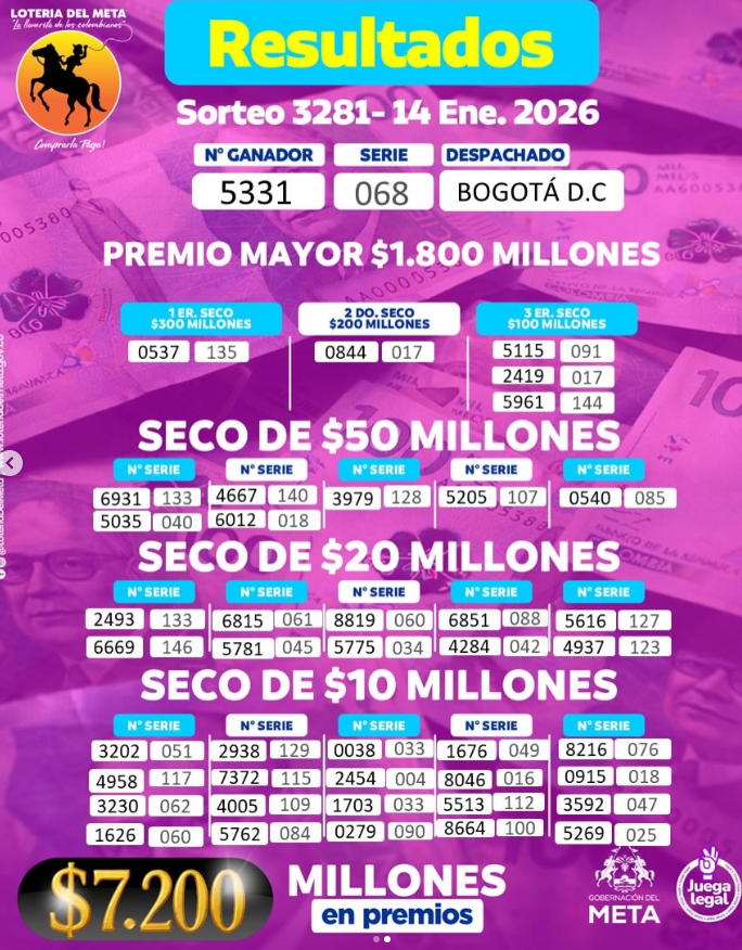 Además, ¿resultado del Baloto y la Lotería de Manizales, la del Valle y la Lotería del Meta . Lo que da más de 31 mil millones de pesos solo si suma los tres premios mayores sorteados y el Baloto…más los premios secos multimillonarios…