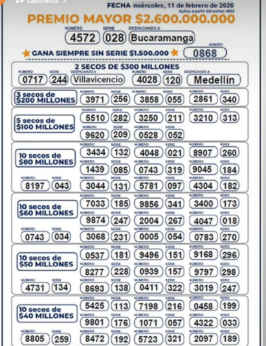 OJO a los resultados de la Lotería de Manizales, con su premio mayor de $ 2.600 millones que es para el NUMERO 4572 de la Serie 028: