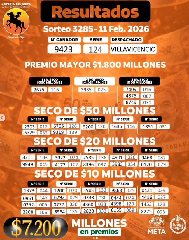 Pero aquí en www.rutanoticias.co le damos mucho gusto con el resultado del Baloto y la Lotería de Manizales, la del Valle y la de Meta. ¿Quiere más? Mire estos resultados de la Lotería del Meta, cuyo PREMIO MAYOR fue vendido en VILLAVICENCIO:
