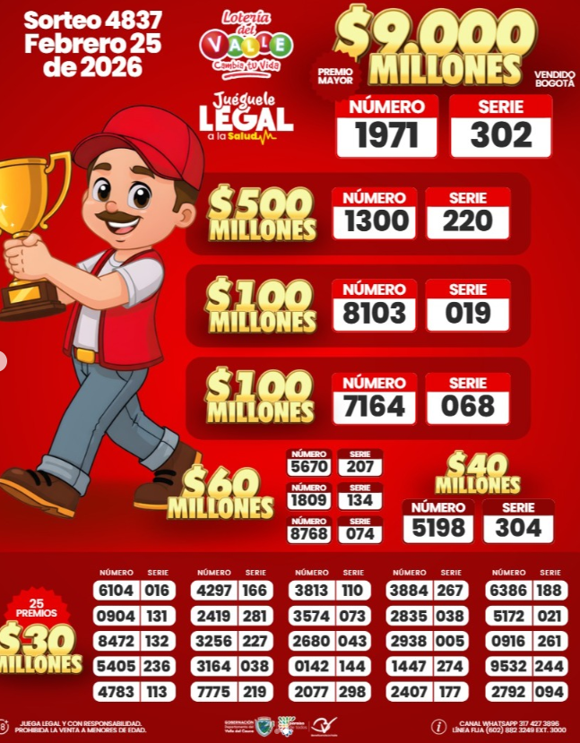 Revise…revise muy bien estos resultados de la Lotería del Valle y el premio mayor, que fue vendido en BOGOTA: