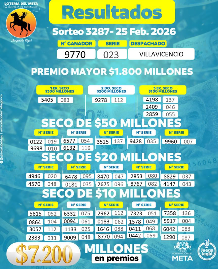 Pero aquí en www.rutanoticias.co le damos mucho gusto con el resultado del Baloto y la Lotería de Manizales, la del Valle y la de Meta. ¿Quiere más? Mire estos resultados de la Lotería del Meta, cuyo PREMIO MAYOR fue vendido en VILLAVICENCIO: