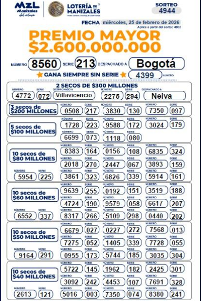 OJO a los resultados de la Lotería de Manizales, con su premio mayor de $ 2.600 millones que es para el NUMERO 8560 de la Serie 213: