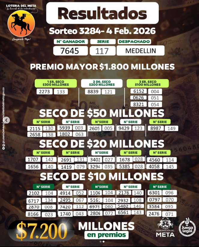 Pero aquí en www.rutanoticias.co le damos mucho gusto con el resultado del Baloto y la Lotería de Manizales, la del Valle y la de Meta. ¿Quiere más? Mire estos resultados de la Lotería del Meta, cuyo PREMIO MAYOR fue vendido en MEDELLÍN: