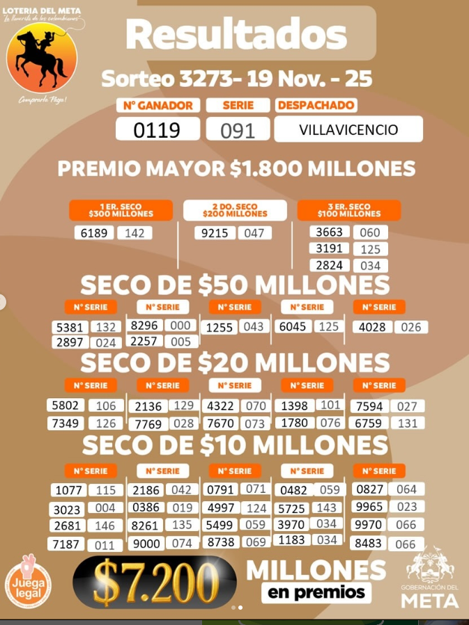 Además, ¿resultado del Baloto y la Lotería de Manizales, la del Valle y la Lotería del Meta (cuyo premio mayor cayó en VILLAVICENCIO? Lo que da más de 31 mil millones de pesos solo si suma los tres premios mayores sorteados y el Baloto…más los premios secos multimillonarios…