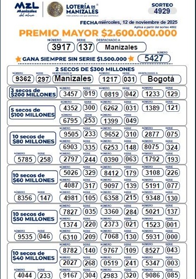 OJO a los resultados de la Lotería de Manizales, con su premio mayor de $ 2.600 millones que fue vendido en Manizales: