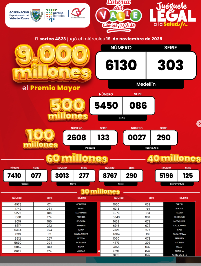 Revise…revise muy bien estos resultados de este miércoles 19 de Noviembre del año 2025 de la Lotería del Valle, y el premio mayor vendido en MEDELLIN: