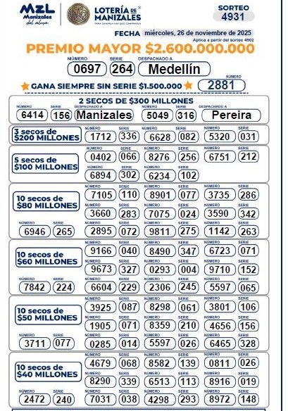 OJO a los resultados de la Lotería de Manizales, con su premio mayor de $ 2.600 millones que fue vendido en MEDELLIN:
