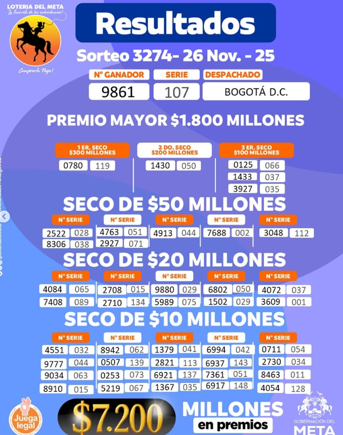 Además, ¿resultado del Baloto y la Lotería de Manizales, la del Valle y la Lotería del Meta (cuyo premio mayor cayó en BOGOTÁ? Lo que da más de 31 mil millones de pesos solo si suma los tres premios mayores sorteados y el Baloto…más los premios secos multimillonarios…