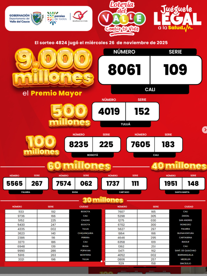 Revise…revise muy bien estos resultados de este miércoles 26 de Noviembre del año 2025 de la Lotería del Valle, y el premio mayor vendido en CALI: