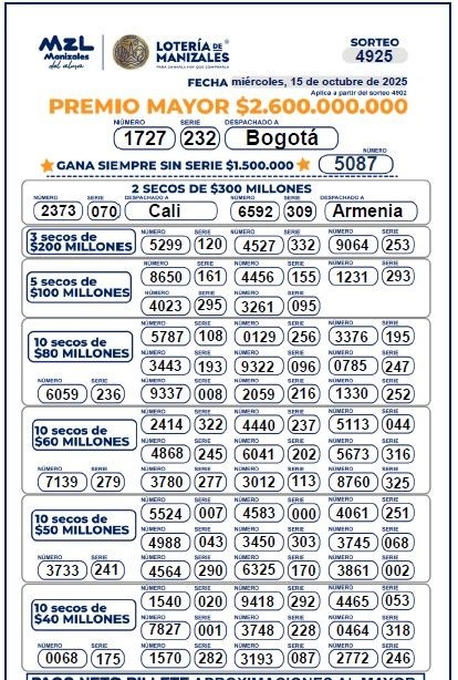 ¿Quiere saber el resultado del Baloto y la Lotería de Manizales? y OJO con los resultados de las Loterías del Valle y la del Meta, que sortearon este miércoles 15 de OCTUBRE de 2025.