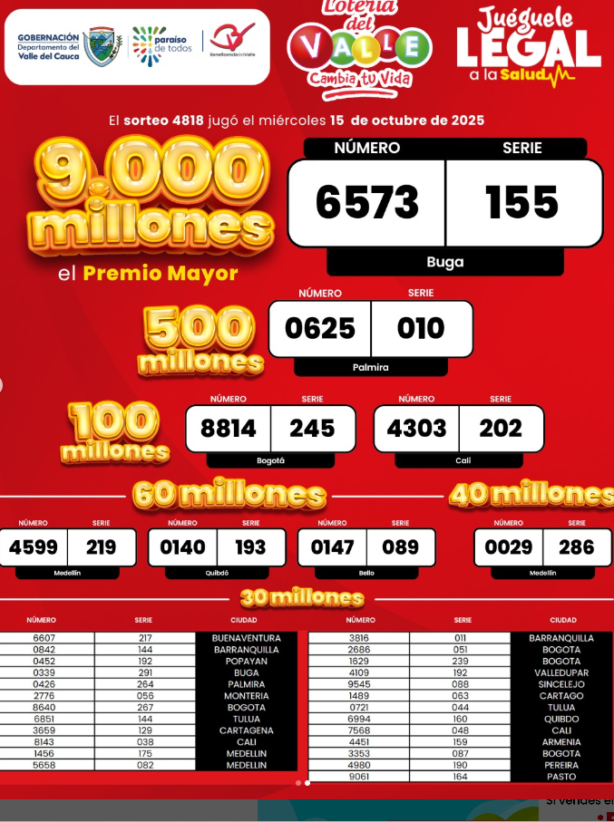 Revise…revise muy bien estos resultados de este miércoles 15 de octubre del año 2025 de la Lotería del Valle: