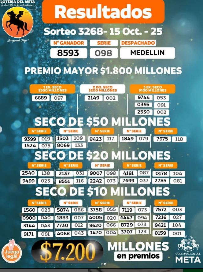 Además, ¿resultado del Baloto y la Lotería de Manizales (cuyo premio MAYOR cayó en BOGOTA), la del Valle y la Lotería del Meta (cuyo premio mayor cayó en MEDELLIN? Lo que da más de 31 mil millones de pesos solo si suma los tres premios mayores sorteados y el Baloto…más los premios secos multimillonarios…