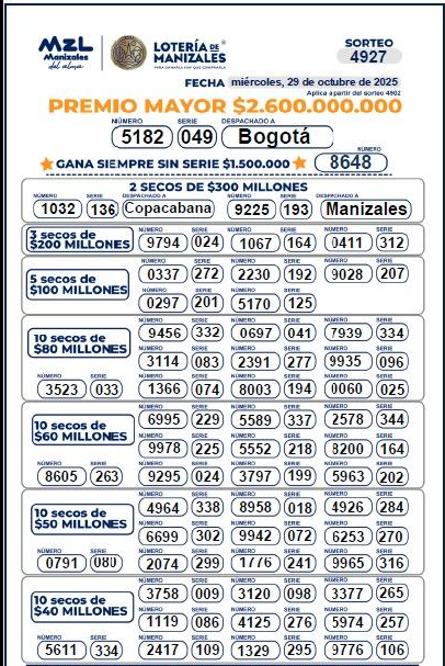 OJO a los resultados de la Lotería de Manizales, con su premio mayor de $ 2.600 millones que fue vendido en BOGOTA:
