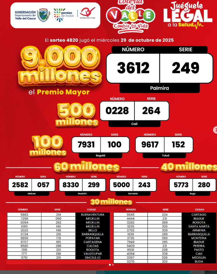 Revise…revise muy bien estos resultados de este miércoles 29 de octubre del año 2025 de la Lotería del Valle, y el premio mayor vendido en Palmira: