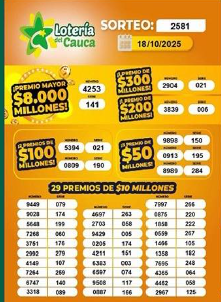 Además, esta Lotería sortea 37 premios secos, que van desde los 300 millones de pesos hasta $ 10 millones (valores a los cuales se les aplica el 37% de deducción). Este es el resultado de la Lotería del Cauca con un Premio Mayor de 8.000 millones de pesos para el número 4253 de la serie 141: