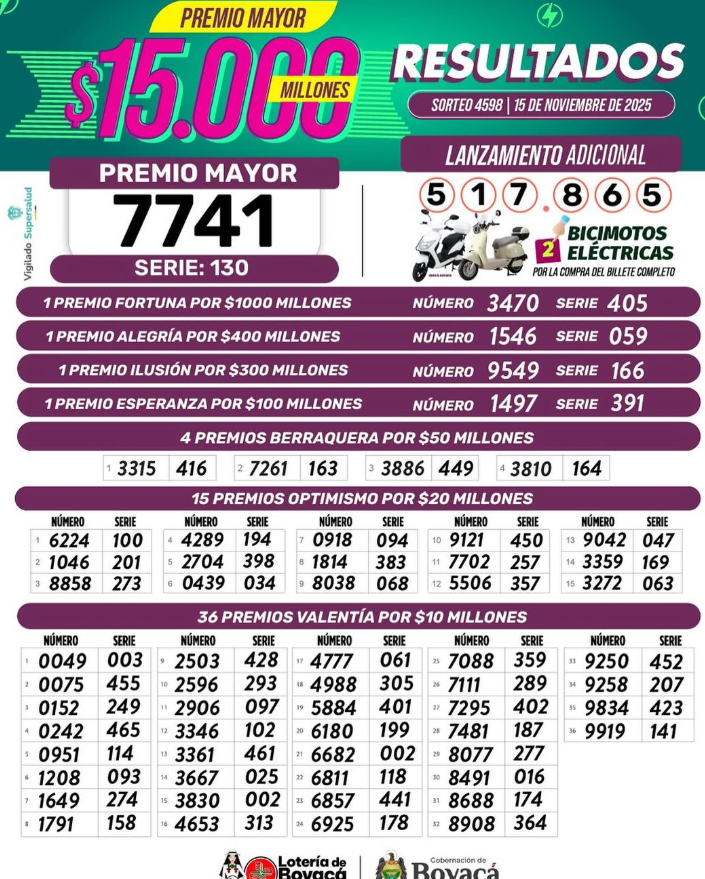 La Lotería de Boyacá sorteó un premio mayor de 15 mil millones de pesos, el cual después de la debida deducción de ley queda en 9.960 millones de pesos que se entregan al ganador, si compró el billete completo.