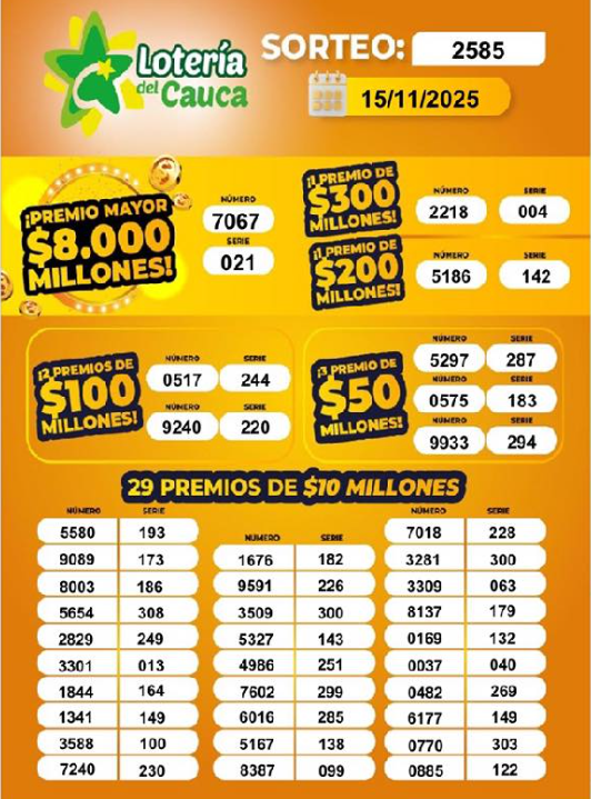 Además, esta Lotería sortea 37 premios secos, que van desde los 300 millones de pesos hasta $ 10 millones (valores a los cuales se les aplica el 37% de deducción). Este es el resultado de la Lotería del Cauca con un Premio Mayor de 8.000 millones de pesos para el número 7067 de la serie 021: