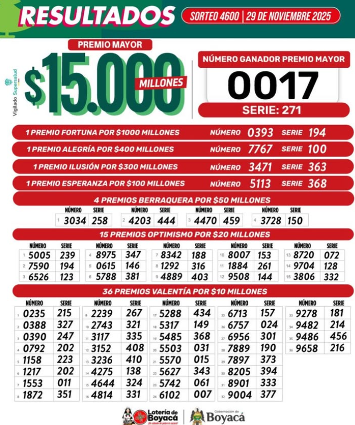 La Lotería de Boyacá sorteó un premio mayor de 15 mil millones de pesos, el cual después de la debida deducción de ley queda en 9.960 millones de pesos que se entregan al ganador, si compró el billete completo.