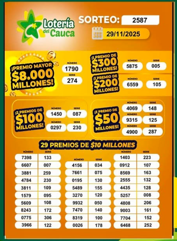 Además, esta Lotería sortea 37 premios secos, que van desde los 300 millones de pesos hasta $ 10 millones (valores a los cuales se les aplica el 37% de deducción). Este es el resultado de la Lotería del Cauca con un Premio Mayor de 8.000 millones de pesos para el número 1790 de la serie 274: