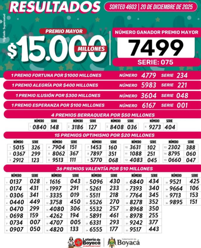 La Lotería de Boyacá sorteó un premio mayor de 15 mil millones de pesos, el cual después de la debida deducción de ley queda en 9.960 millones de pesos que se entregan al ganador, si compró el billete completo.