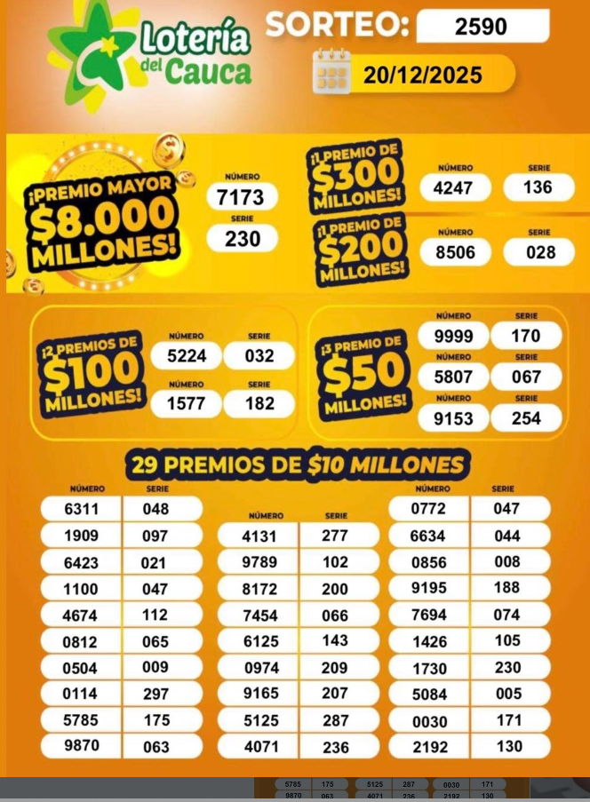 Además, esta Lotería sortea 37 premios secos, que van desde los 300 millones de pesos hasta $ 10 millones (valores a los cuales se les aplica el 37% de deducción). Este es el resultado de la Lotería del Cauca con un Premio Mayor de 8.000 millones de pesos para el número 7173 de la serie 230: