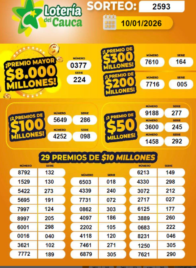 Además, esta Lotería sortea 37 premios secos, que van desde los 300 millones de pesos hasta $ 10 millones (valores a los cuales se les aplica el 37% de deducción). Este es el resultado de la Lotería del Cauca con un Premio Mayor de 8.000 millones de pesos para el número 0377 de la serie 224: