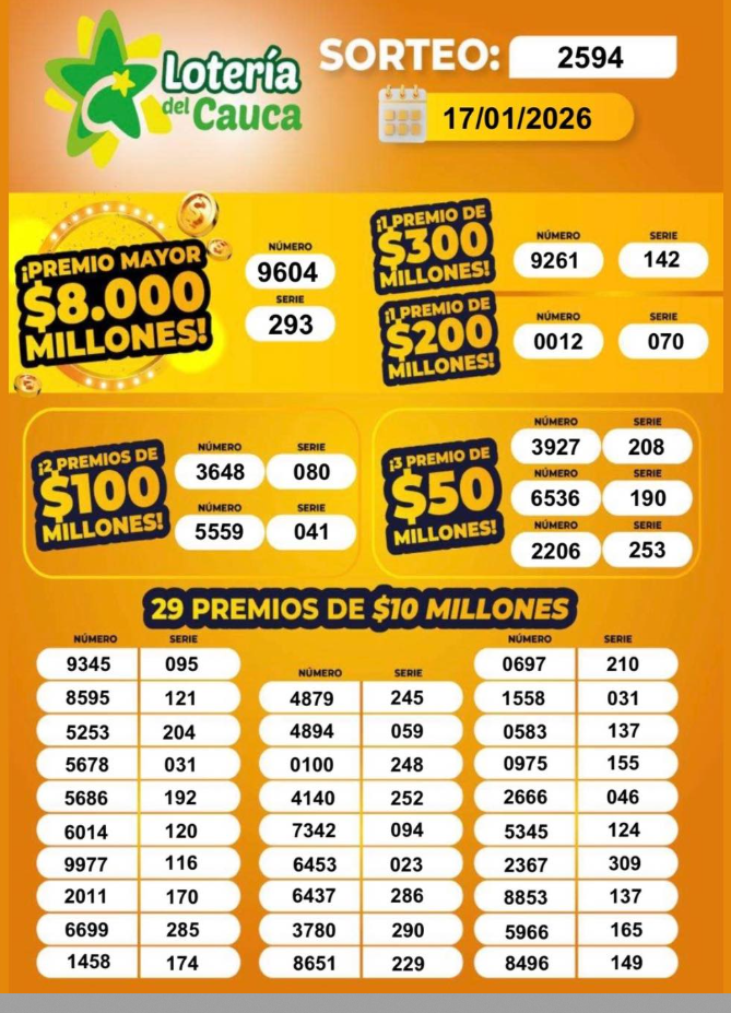 Además, esta Lotería sortea 37 premios secos, que van desde los 300 millones de pesos hasta $ 10 millones (valores a los cuales se les aplica el 37% de deducción). Este es el resultado de la Lotería del Cauca con un Premio Mayor de 8.000 millones de pesos para el número 9604 de la serie 293: