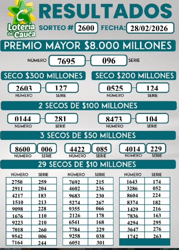 Además, esta Lotería sortea 37 premios secos, que van desde los 300 millones de pesos hasta $ 10 millones (valores a los cuales se les aplica el 37% de deducción). Este es el resultado de la Lotería del Cauca con un Premio Mayor de 8.000 millones de pesos para el número 7695, de la serie 096: