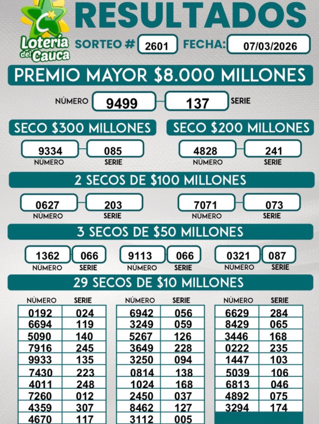 Además, esta Lotería sortea 37 premios secos, que van desde los 300 millones de pesos hasta $ 10 millones (valores a los cuales se les aplica el 37% de deducción). Este es el resultado de la Lotería del Cauca con un Premio Mayor de 8.000 millones de pesos para el número 9499, de la serie 137: